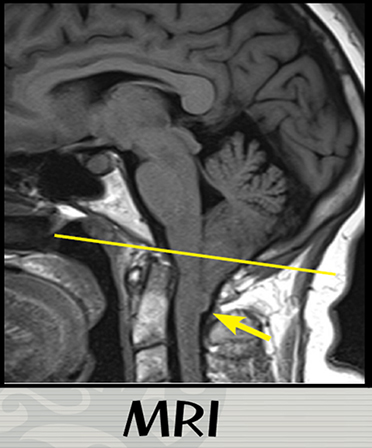 노란실선 : 두개골의 기저부를 연결한 선. 정상적으로 소뇌는 이 선의 상부 ( 두개골 내)에 위치해야 함. 노란 화살표 : 노란 실선의 하방은 척추강 내이며 비정상적인 기형으로 인해 소뇌의 일부가 하방으로 내려와 있음.
